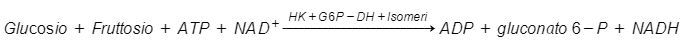 Il glucosio e il fruttosio presenti nel campione sono determinati per via enzimatica e quindi non sono influenzati dalla presenza dei restanti zuccheri riducenti. La reazione redox viene letta a 366 nm (end-point) e il valore è direttamente proporzionale alla concentrazione di glucosio e fruttosio nel campione.